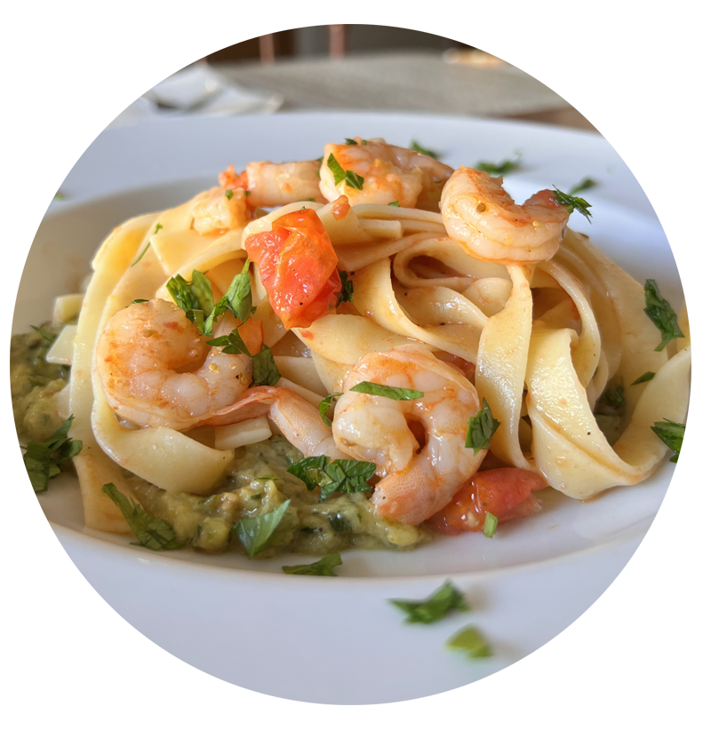 Indulge in our Fettuccine with Shrimps and Cherry Tomatoes, over Zucchini Cream. This pasta dish is a perfect combination of succulent shrimps, juicy cherry tomatoes, and tender fettuccine noodles, all served over a bed of luscious zucchini cream.