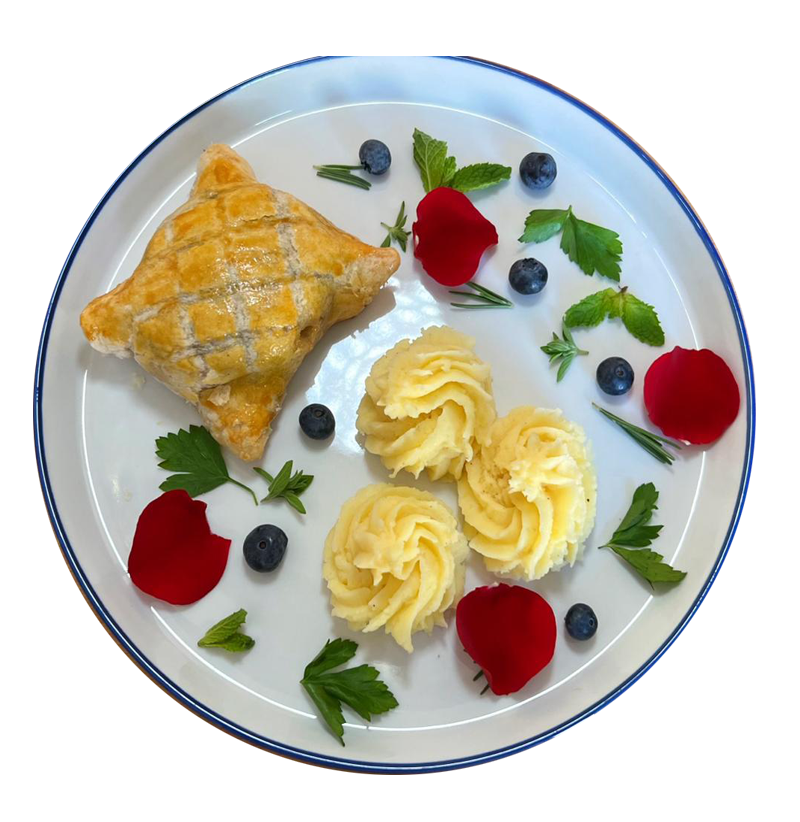 Our Salmon Wellington is served with a creamy dill sauce and a side of fresh vegetables. It's an elegant and delicious dish that will surely impress your guests!