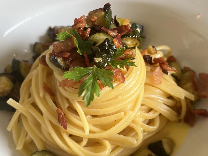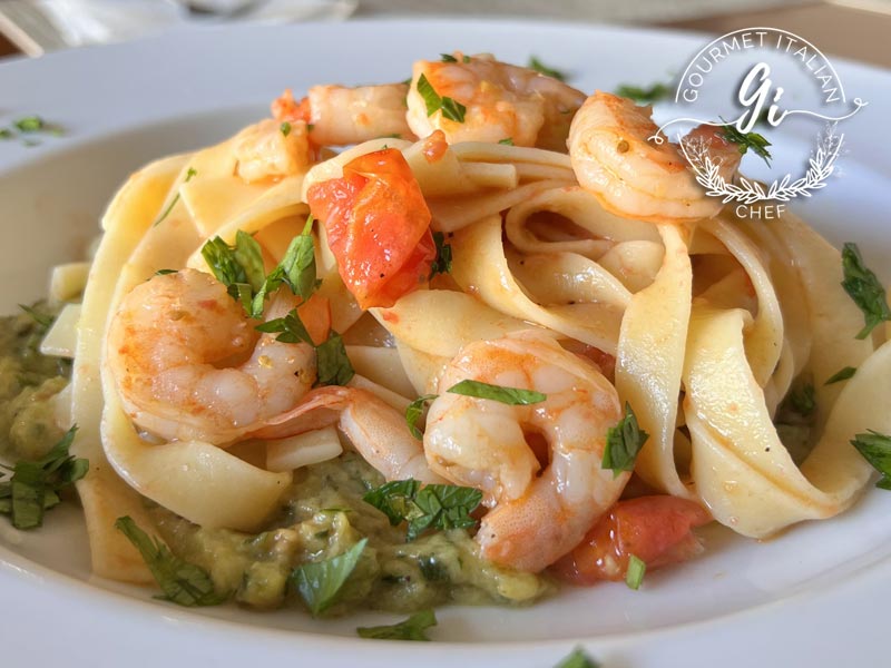 Indulge in our Fettuccine with Shrimps and Cherry Tomatoes, over Zucchini Cream. This pasta dish is a perfect combination of succulent shrimps, juicy cherry tomatoes, and tender fettuccine noodles, all served over a bed of luscious zucchini cream.