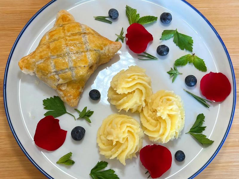 It is baked until the pastry is golden and the salmon is juicy and tender.